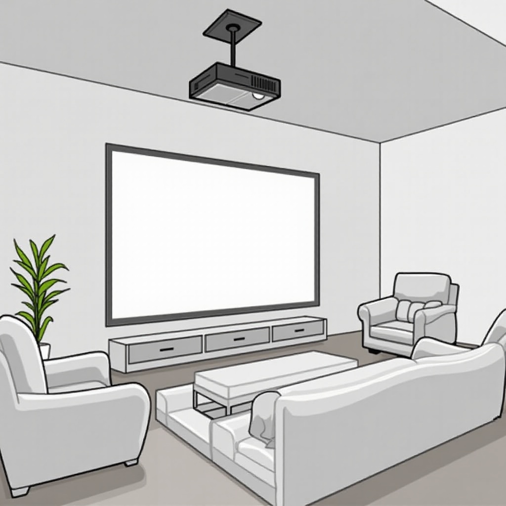 Planejar o layout do seu ambiente é crucial para uma experiência de visualização ideal. Primeiro, determine a melhor posição da tela ou parede para garantir que não haja obstruções e a altura de visualização correta. O ângulo de visualização ideal garante que todos vejam a tela confortavelmente.